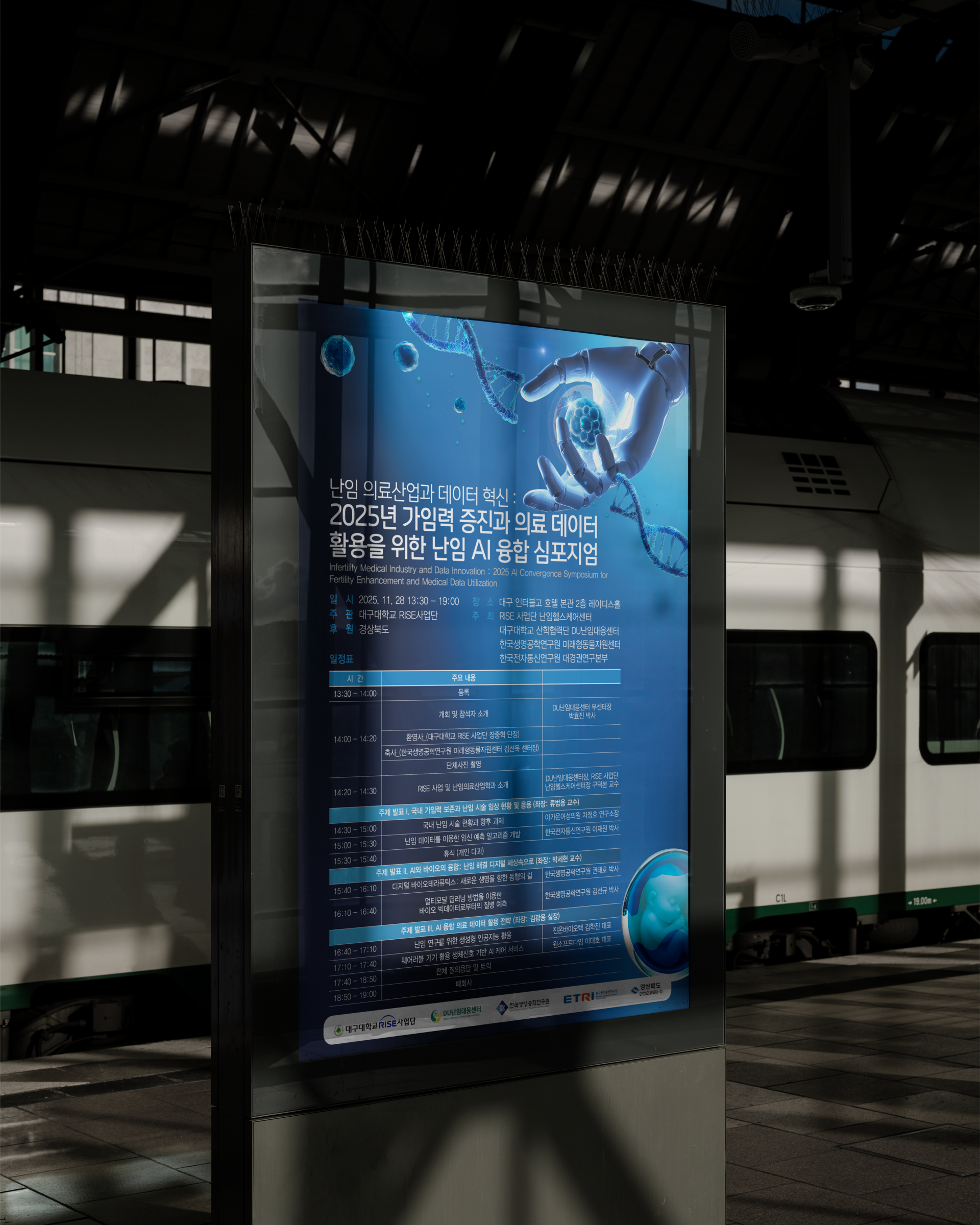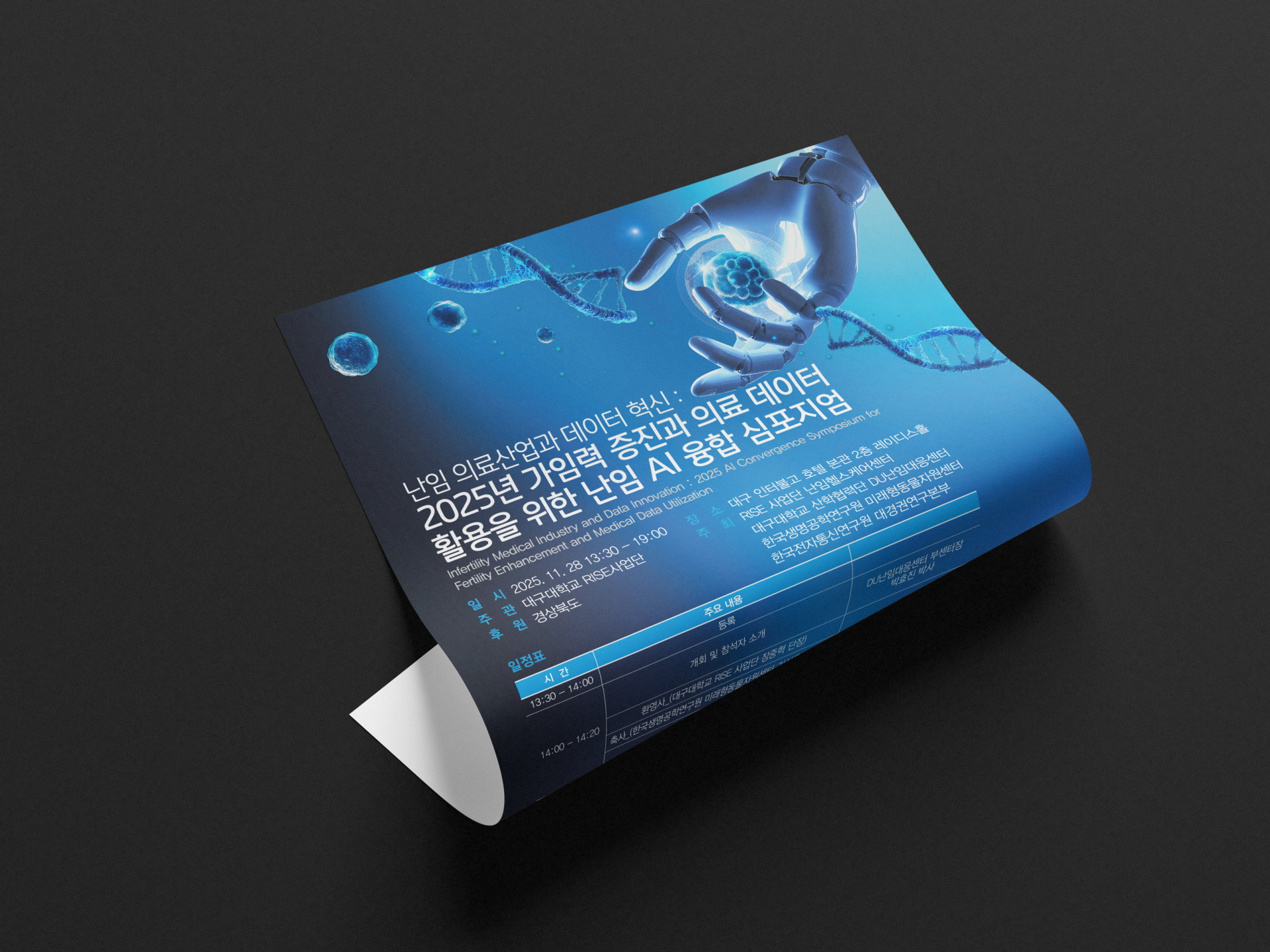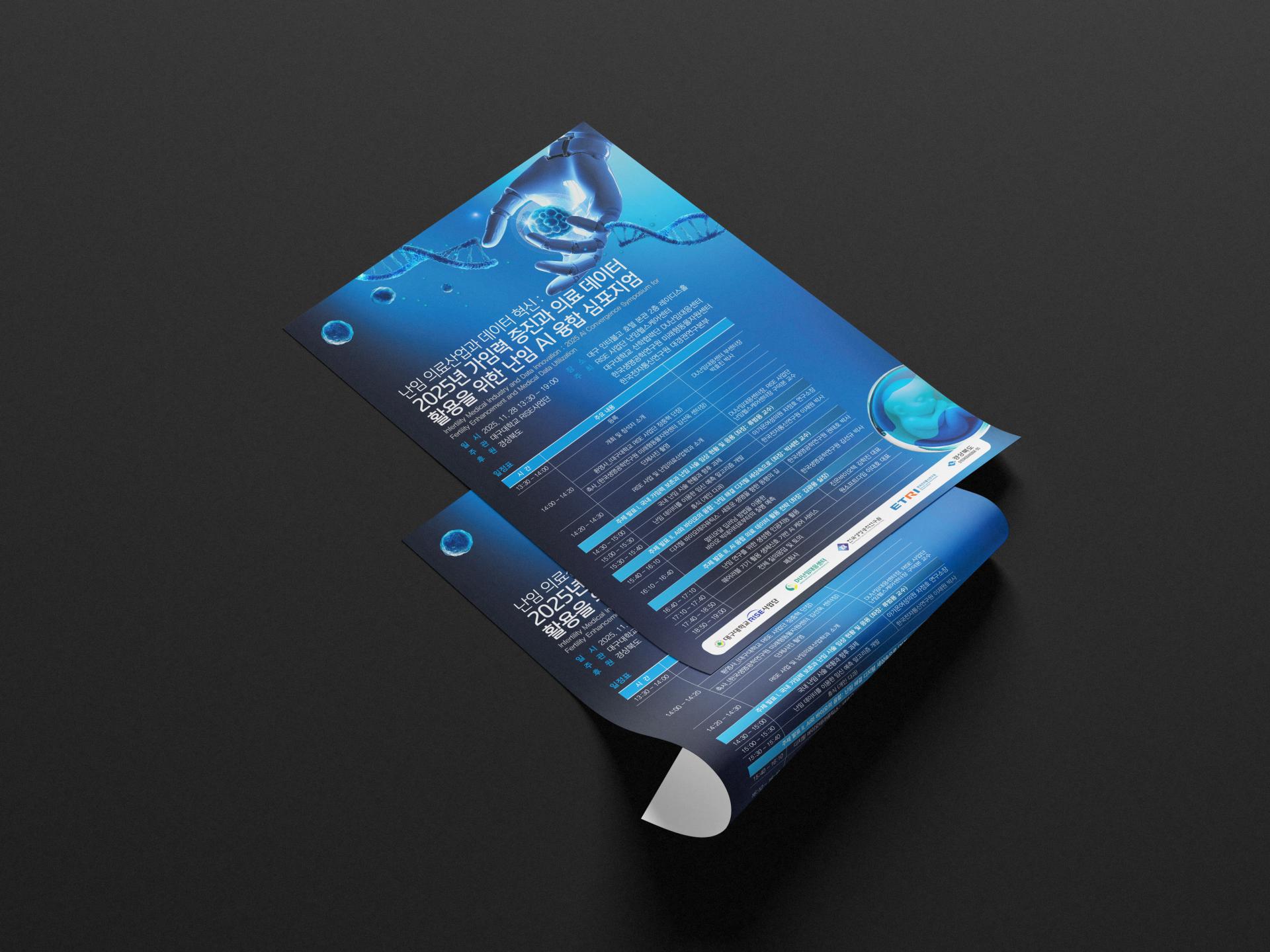 본 심포지엄의 이벤트 아이덴티티는 난임 의료산업과 AI·데이터 기술의 융합이라는 복합적 주제를 하나의 일관된 시각 언어로 정립하는 데 초점을 두고 있습니다. 첨단 기술과 생명의 가치가 만나는 지점을 핵심 개념으로 설정하여, 미래 의료 혁신을 논의하는 공적·학술적 행사로서의 정체성을 명확히 구축했습니다.
