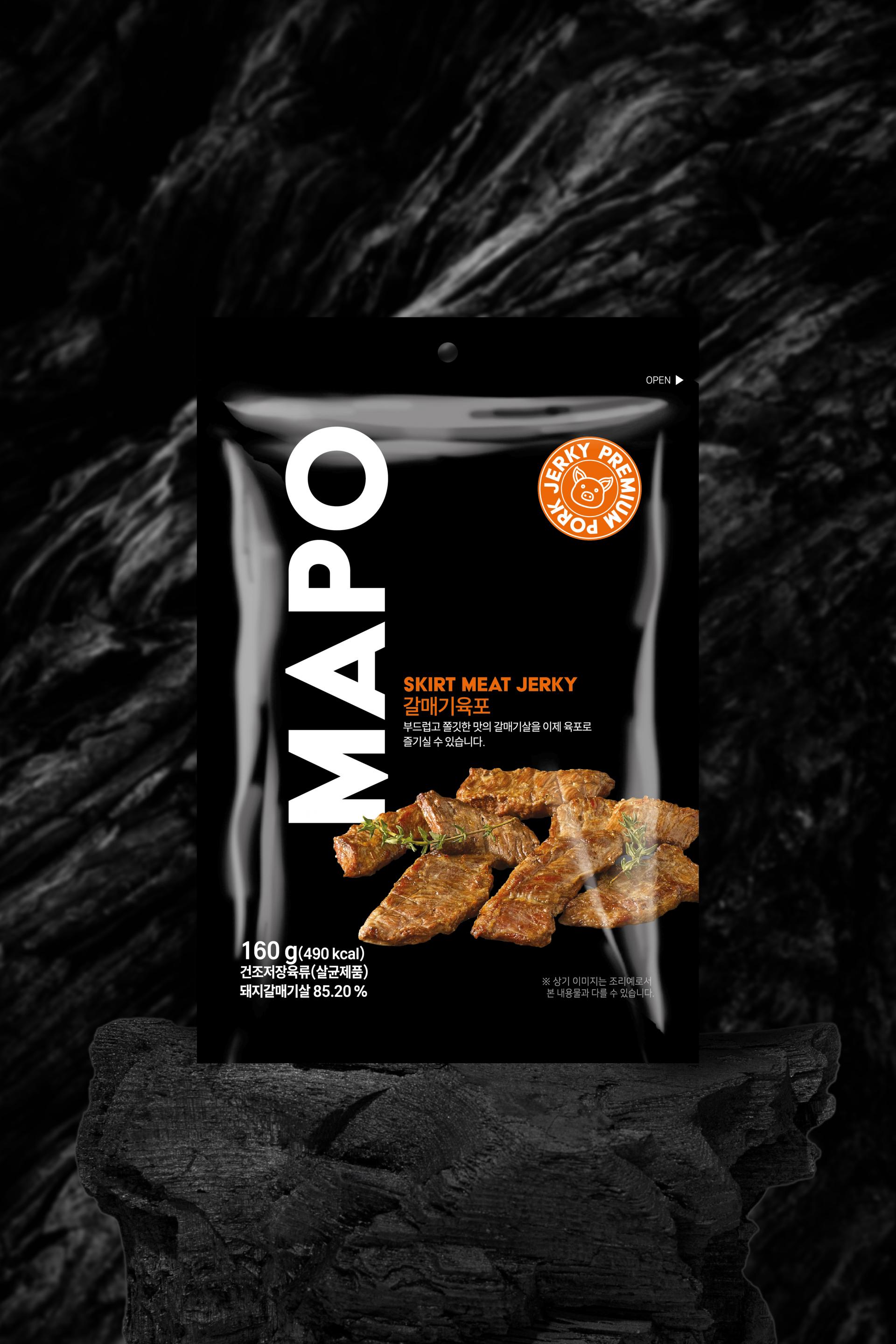 The black background conveys a luxurious and bold impression, while the diagonally placed "MAPO" text creates visual rhythm and reinforces brand recognition. The circular emblem at the top highlights the product’s premium pork jerky quality, and the realistic product image on the front allows consumers to easily grasp the key features of the jerky at a glance.